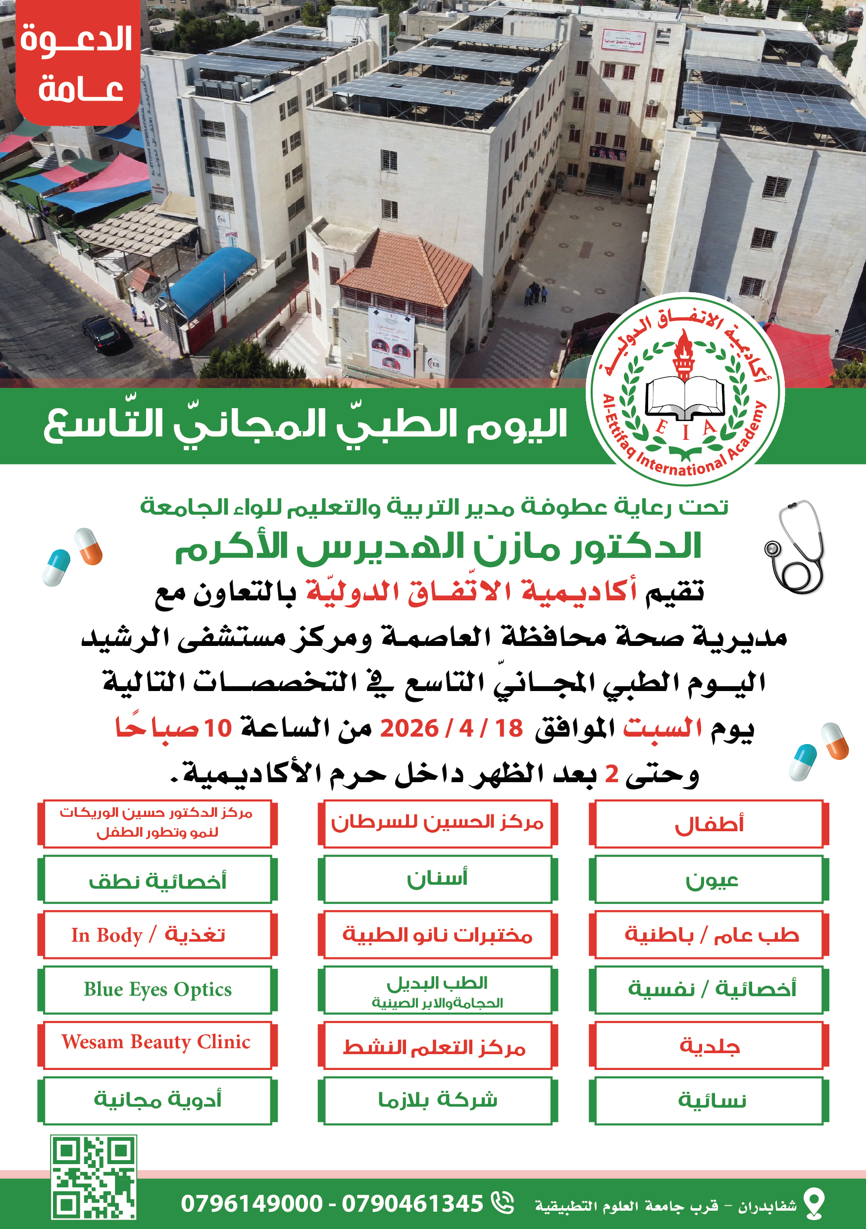 إلى أهالي شفابدران وما حولها تنظم أكاديمية الاتفاق الدولية اليوم الطبي المجاني التاسع بالتعاون مع مركز مستشفى الرشيد داخل حرم الأكاديمية يوم السبت 18/4/2026 ، من الساعة العاشرة وحتى الساعة الثانية مساءً.